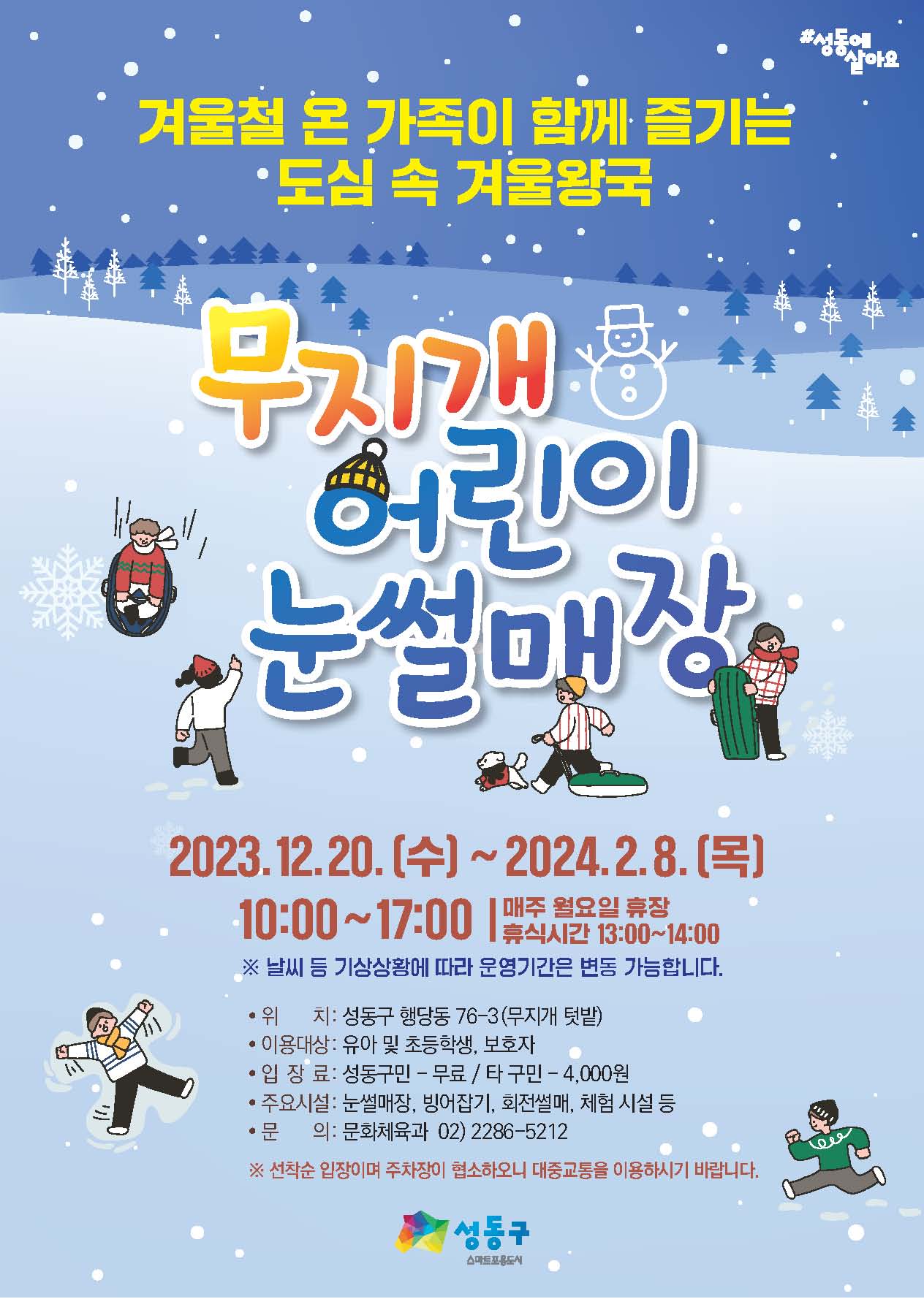 무지개 어린이 눈썰매장이 개장하였고 성동구민은 무료입니다.