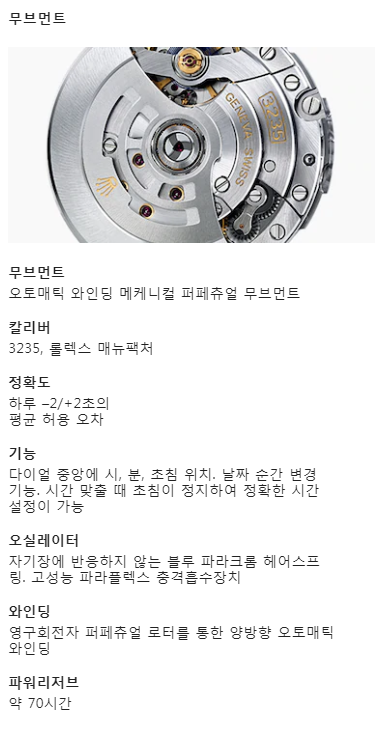 참고로 롤렉스에서 제공하는 3235 무브먼트의 스펙은 다음과 같습니다.
